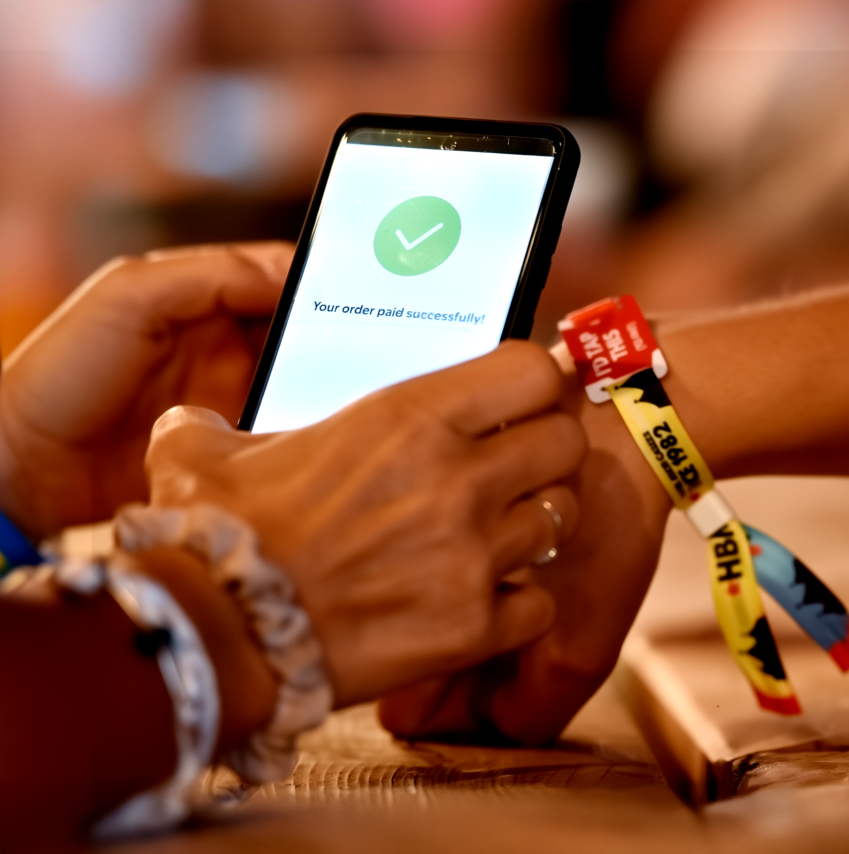 Once the order was ready, the screen showed a clear total and prompt: “Total $24. Tap wristband to pay.” After payment, it instantly confirmed with a big green checkmark.Kind Error Feedback