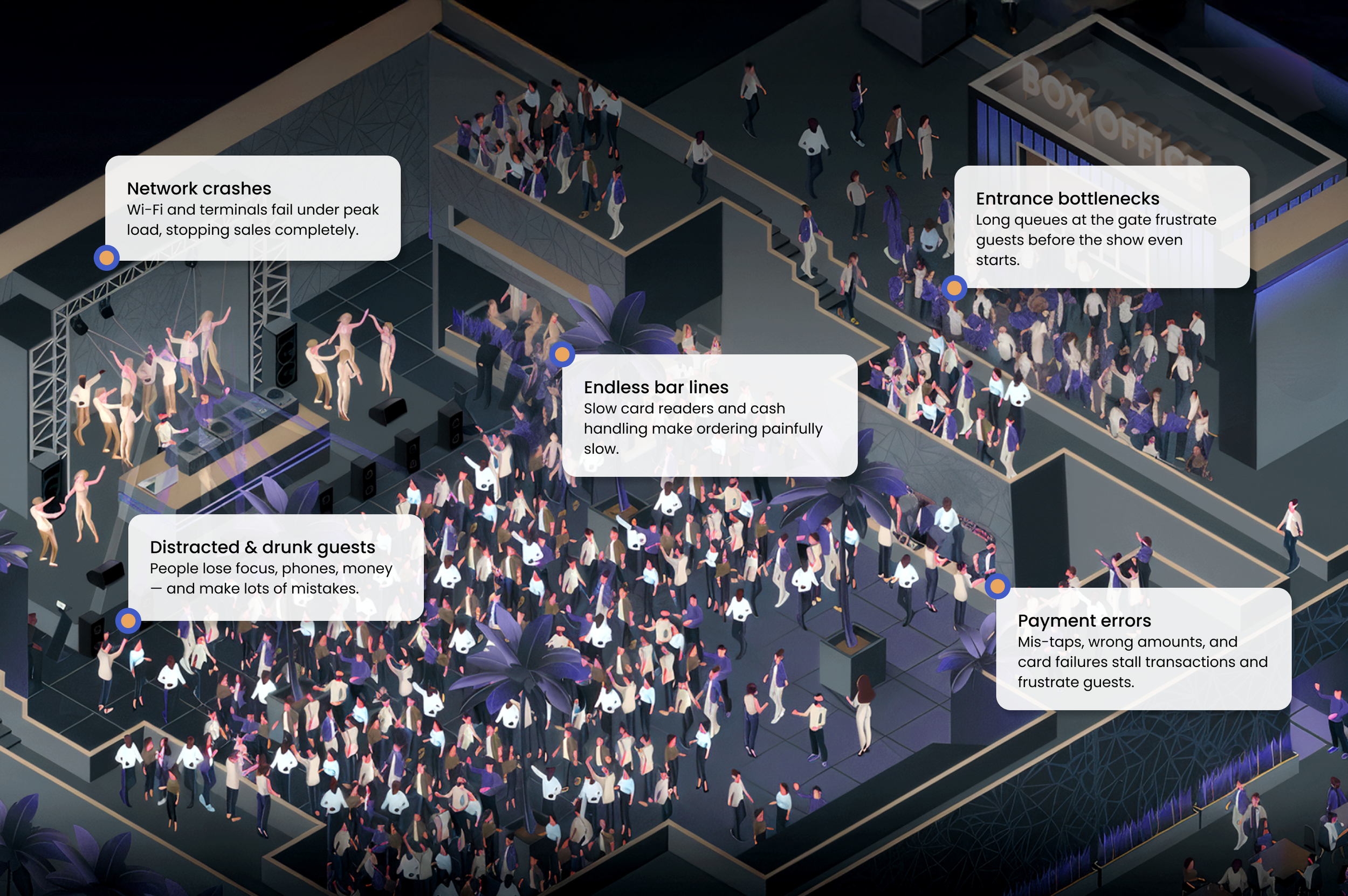 Guests were no easier: distracted, emotional, and often not fully sober, they gave only split-second attention to the screen. A single mis-tap could turn a $10 drink into a $100 charge, with no chance to explain mid-rush. Add failing networks, endless bar lines, and frustrated crowds, and every transaction carried the risk of slowing the whole event.